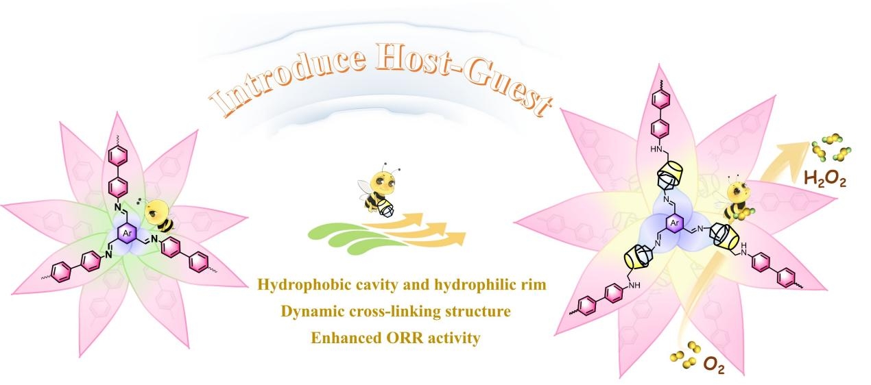 基于这一科学问题,团队实施了一种创新的动态主客体策略,旨在精确调控并合成高性能的超分子电催化剂。具体通过将主客体单元插入到共轭微孔分子骨架中,成功开发出两种新型动态交联的超分子电催化剂。动态可调的分子网络显著增强了这些结构框架内的电荷转移,优化了活性位点的电子结构,影响了主客超分子的本征活性,从而实现了优异的两电子氧还原电催化性能。