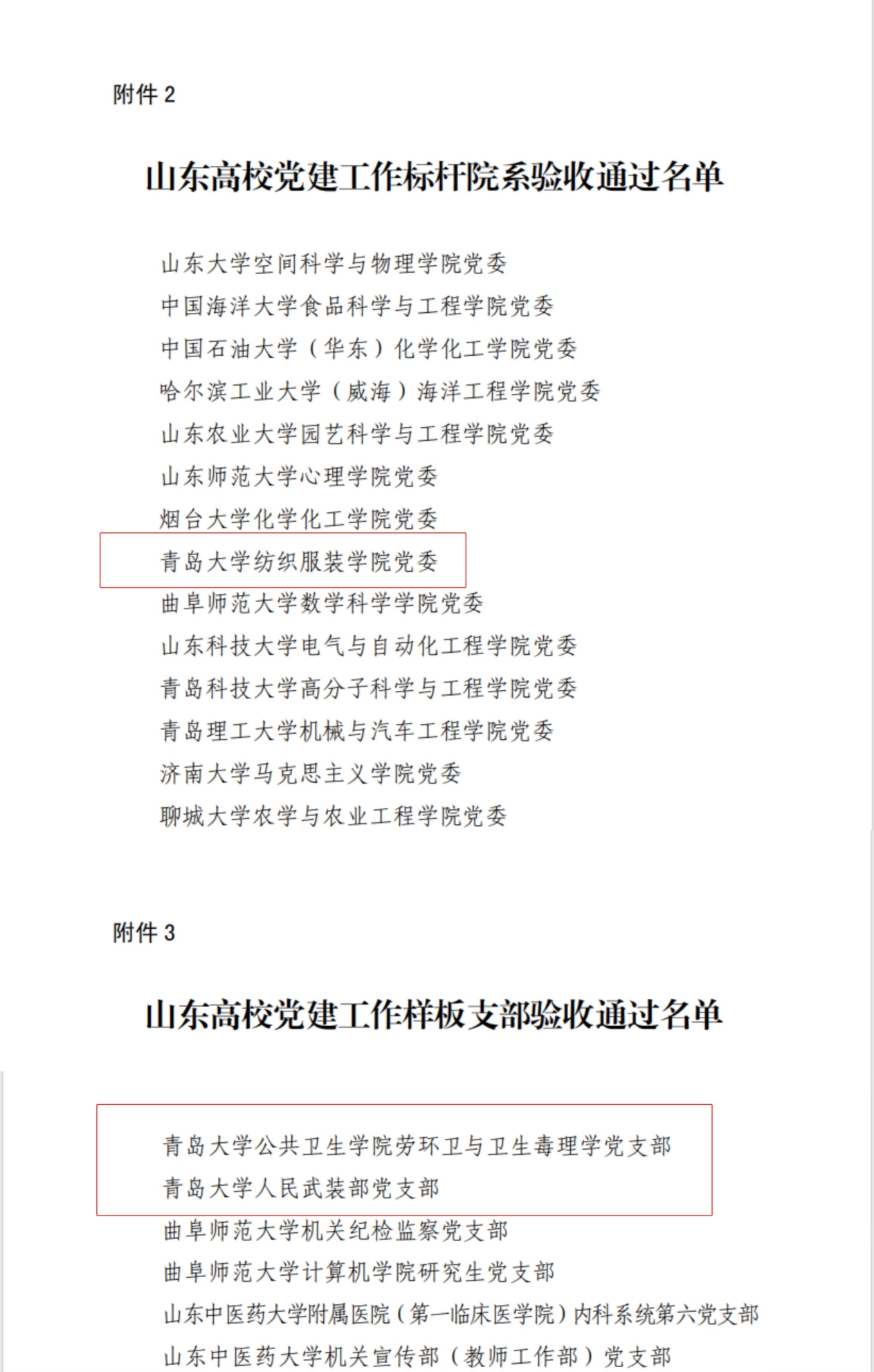 新闻网讯 近日,山东省委教育工委公布了第二批山东高校党建“双创”培育创建工作验收通过名单,PA视讯纺织服装学院党委、公共卫生学院劳环卫与卫生毒理学党支部、人民武装部党支部三个党组织顺利通过验收。