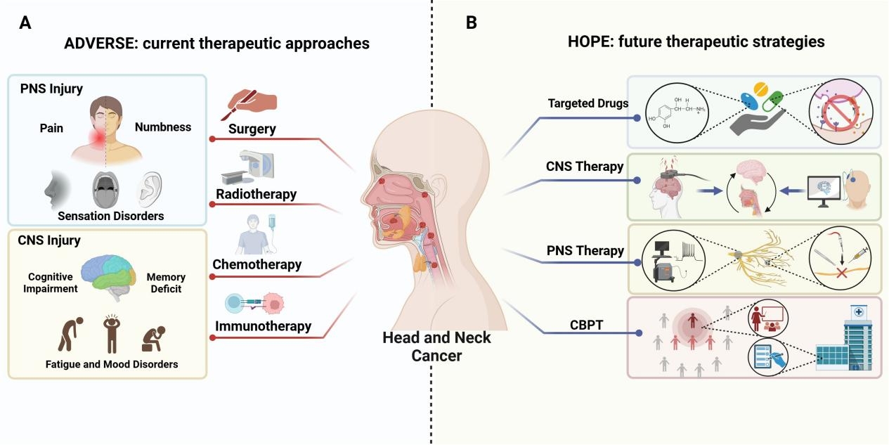 近年来,越来越多的研究证实HNC是一种具有显著神经参与的恶性肿瘤,它不仅存在局部频发的神经侵袭现象,而且会引发一定的神经系统症状及更深层次的“神经-癌症串扰”对话,给患者、家庭以及社会带来诸多不良影响。随着癌症神经科学的不断发展,HNC与神经系统之间的相互作用关系及其潜在机制也逐渐被揭示,从癌细胞与神经细胞之间的相互串扰到肿瘤进展过程中对神经系统的影响均逐渐获得越来越多的有力证据支持。