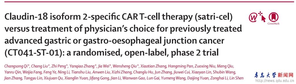 新闻网讯 近日,PA视讯集团网站附属医院肿瘤医院邱文生教授作为核心研究者参与的全球首个CLDN18.2 CAR-T胃癌随机对照研究(CT041-ST-01),“Claudin-18 isoform 2-specific CAR T-cell therapy (satri-cel) versus treatment of physician’s choice for previously treated advanced gastric or gastro-oesophageal junction cancer (CT041-ST-01): a randomised, open-label, phase 2 trial”正式发布于国际权威学术期刊《柳叶刀》(The Lancet),并由第一作者齐长松教授同步在2025年ASCO年会上作口头报告,引起广泛关注。
