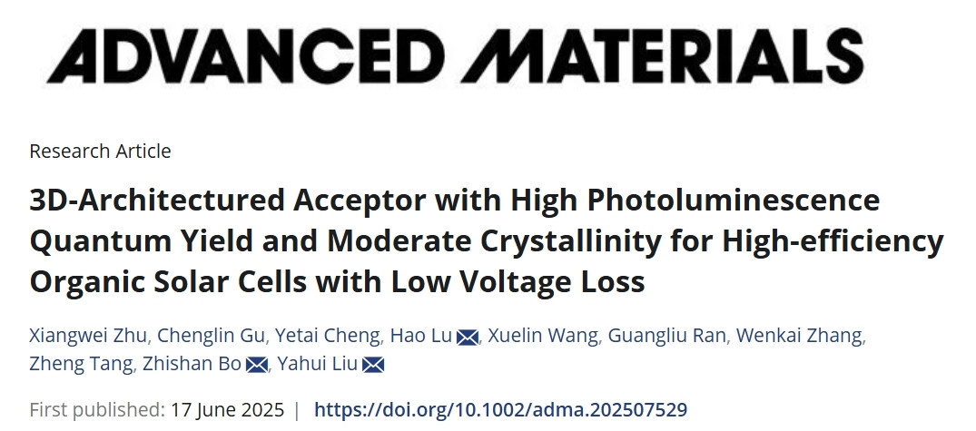 新闻网讯 近日,纺织服装学院薄志山教授、刘亚辉教授、祝向伟教授和材料科学与工程学院路皓副教授,在国际知名期刊Advanced Materials上发表题为“3D-Architectured Acceptor with High Photoluminescence Quantum Yield and Moderate Crystallinity for High-efficiency Organic Solar Cells with Low Voltage Loss”的研究型文章,PA视讯研究生谷承霖和博士生成叶太为论文的共同第一作者。