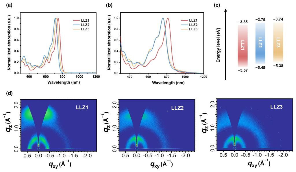(d)LLZ1、LLZ2和LLZ3分子的二维掠入射X射线衍射图。