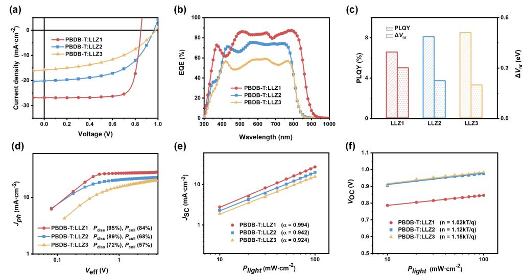 图3. 由聚合物PBDB-T与LLZ1、LLZ2和LLZ3分别组成的三种二元光伏器件的性能表现