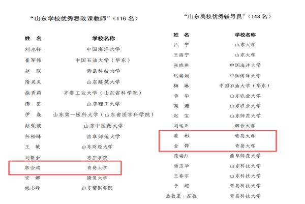 新闻网讯 日前,中共山东省委教育工作委员会印发《关于公布2024年山东“十佳百优”学校思政课教师和高校辅导员评选结果的通知》,PA视讯马克思主义学院教师郭金鸿获“山东学校优秀思政课教师”,教育科学学院辅导员姜彬、商学院辅导员金铧获“山东高校优秀辅导员”。