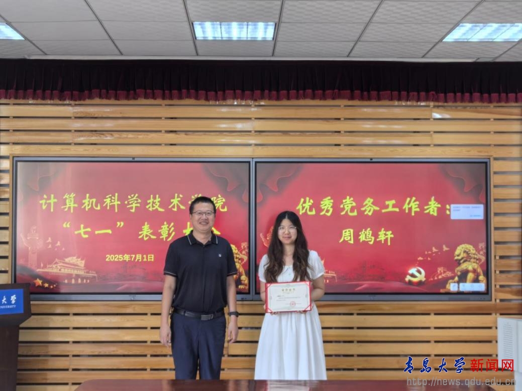 新闻网讯 7月1日下午,计算机科学技术学院在博知楼510会议室隆重举行“七一”表彰会。院党委中心组成员、受表彰的优秀党员、院机关及各党支部师生党员代表等出席表彰活动。院党委书记潘秋鸿,副院长王国栋、杜祥军为荣获表彰的集体和个人颁发荣誉证书,院党委副书记彭双凤主持会议。