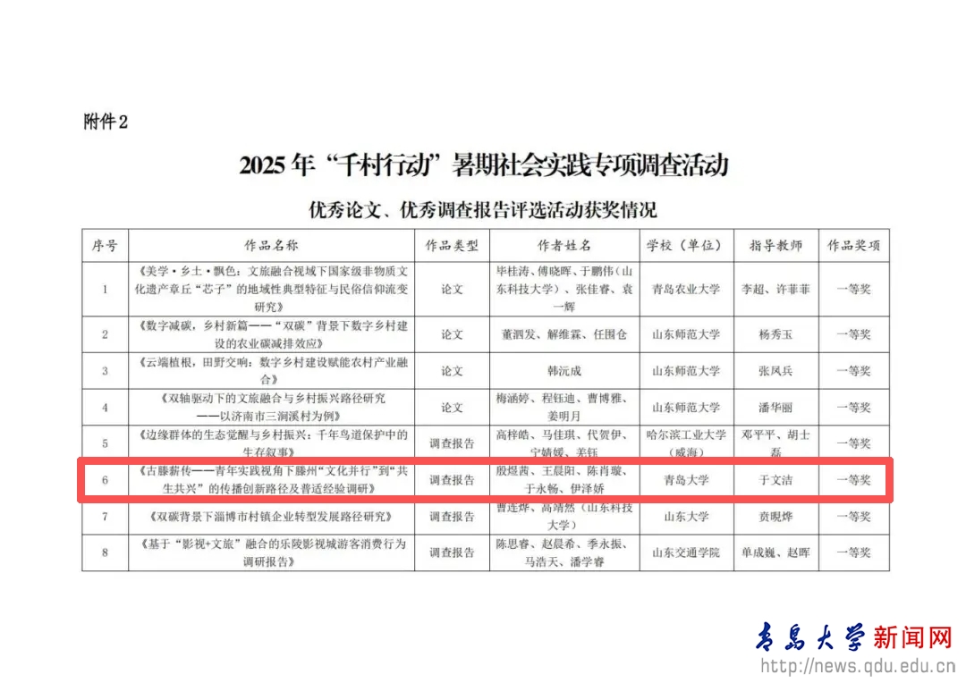 2025年“千村行动”暑期社会实践专项调查活动吸引了省内外53所高校近1000支实践队伍、2000余名师生参与,产生了广泛的社会影响。经济学院学生作品《古滕薪传一一青年实践视角下滕州“文化并行”到“共生共兴”的传播创新路径及普适经验调研》荣获优秀论文和优秀调查报告一等奖、PA视讯集团网站荣获优秀组织单位、经济学院党委副书记于文洁荣获优秀指导教师、殷煜茜、王晨阳荣获社会调查先进个人。