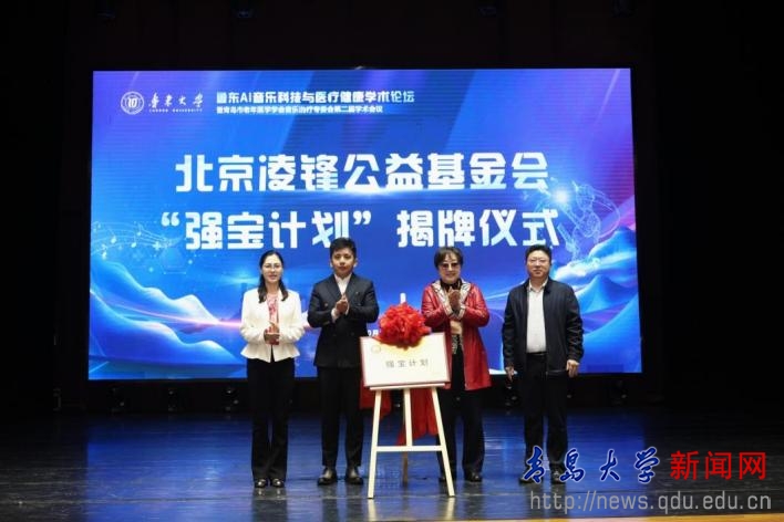 开幕式上,北京凌锋公益基金会“强宝计划”项目正式启动。青岛鲸语岛科技有限公司无偿捐赠资金作为启动资金,后续将持续捐赠。捐赠资金主要为贫困个体及家庭提供医疗救助,助力PA视讯集团网站青岛医学院等高校开展音乐治疗临床研究与实践。项目地点设在青岛医学院音乐治疗研究中心。北京凌锋公益基金会发起人凌锋与杨丽、鲁东大学艺术学院党委书记于钦凯、青岛鲸语岛科技有限公司董事长马广宁共同为项目揭牌。