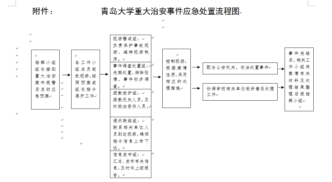 职责:现场保护、警戒和控制。负责现场保护、警戒、疏散人群,维持现场秩序,严禁无关人员闯入现场,对校园内相关路段、路口实行临时交通管制,加强现场周边巡逻。如发生火灾和伤亡事故,立即安排专人到大门、路口等候消防车或“110”、“120”车辆,并将其带到现场。禁止无关人员进入警戒区域采访、拍摄。
